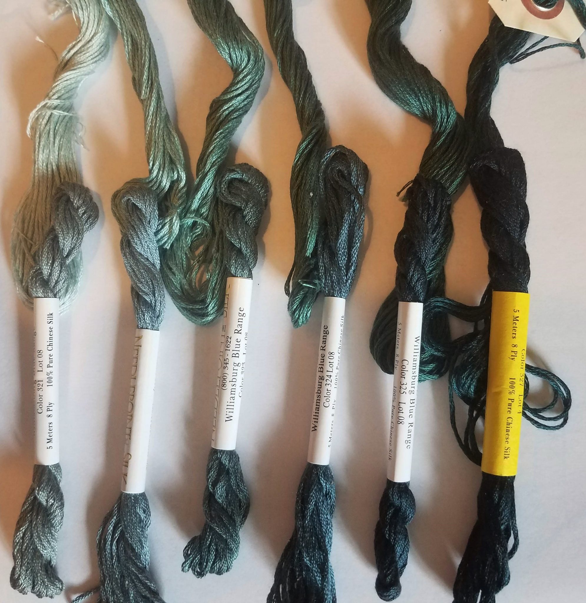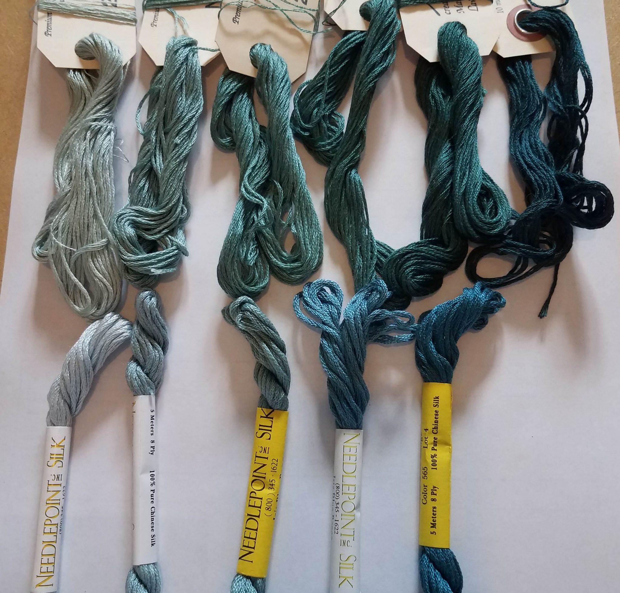 Probably not a surprise, there is no blue conversion in DMC or anchor that is remotely satisfying. So, over to the silks we go. Again, Needlepoint Inc is my go-to, since their luster is subtle, dye lots are relatively stable, and they make complete sets of shades.
