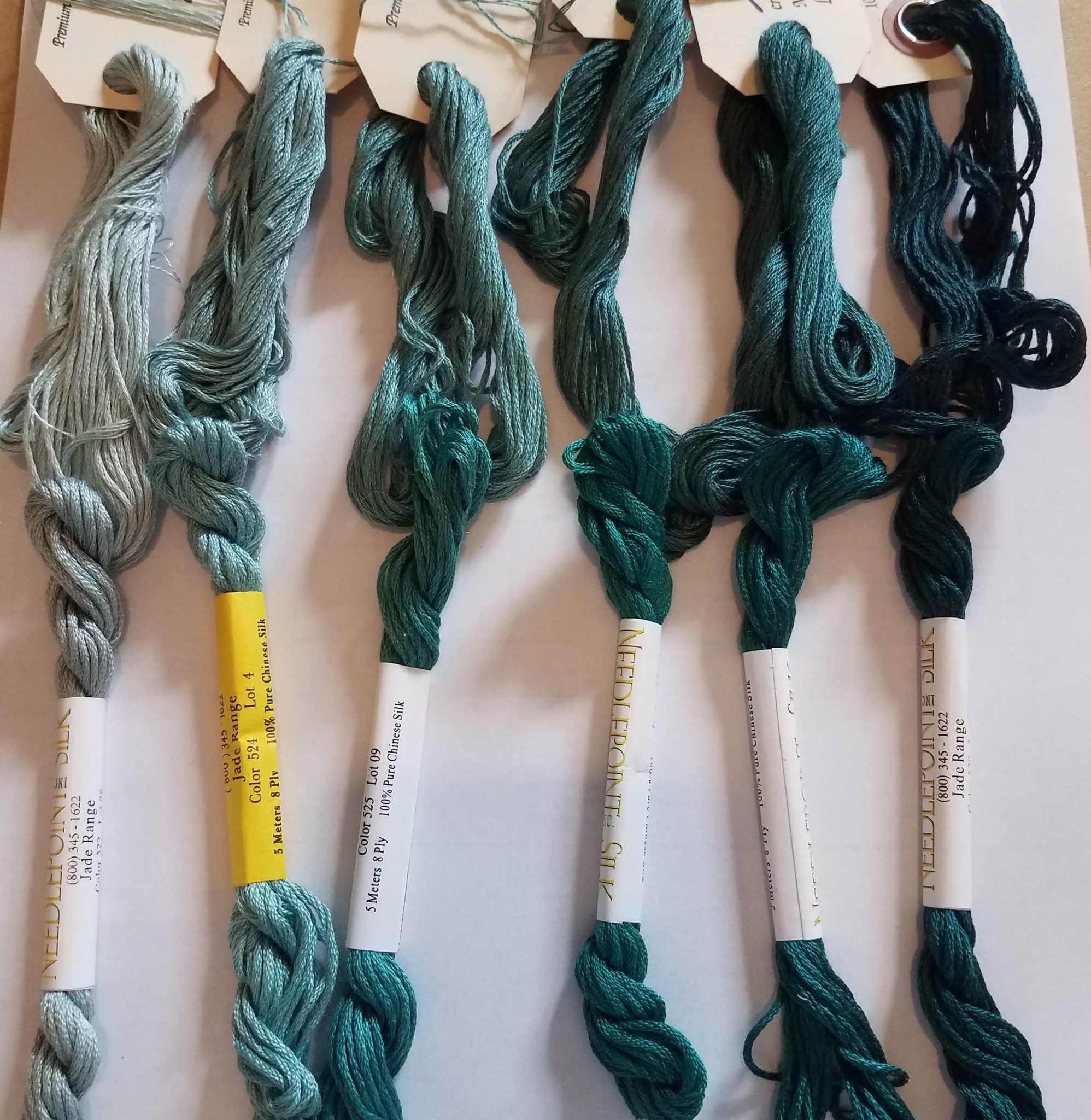 Rainbow Gallery makes really lovely threads. Splendor is a 12-ply silk, and Mandarin is a 6-strand bamboo fiber. Marilyn’s recommendation is to use five Splendor shades and one Mandarin: from lightest to darkest, S931, S932, S1029, S1030, S1076, and M896. Here’s what it looks like (I am out of stock on S1030 at the moment but you get the idea):