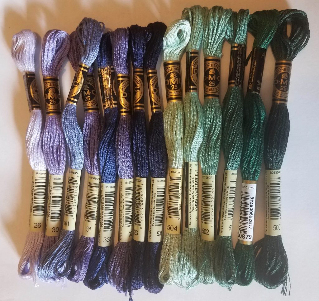 Marilyn’s recommendation is to use the five DMC shades 500 – 504 to create six shades. Ostensibly, you would blend 500 and 501 to get 2105. If you’re too lazy to blend (no judgment here!), Anchor 879 sits nicely in the gap between 501 and 500.