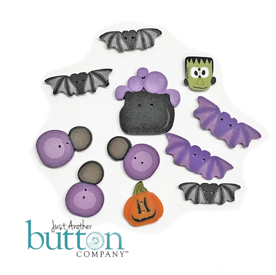Contains buttons used in Praiseworthy Stitches’ “Ghoul’s Crossing” design.