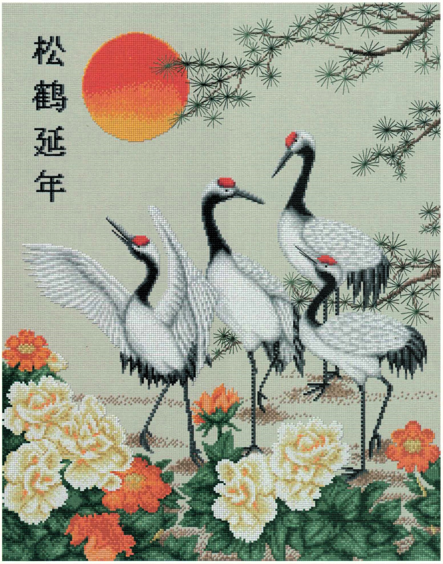 The design showcases four graceful red-crowned cranes in various poses against a backdrop of a glowing orange sunset and delicate pine needles. Lush white and coral peonies bloom in the foreground, while Japanese characters add authentic cultural elements to this tranquil scene that captures the harmony between wildlife and nature in traditional Asian art.