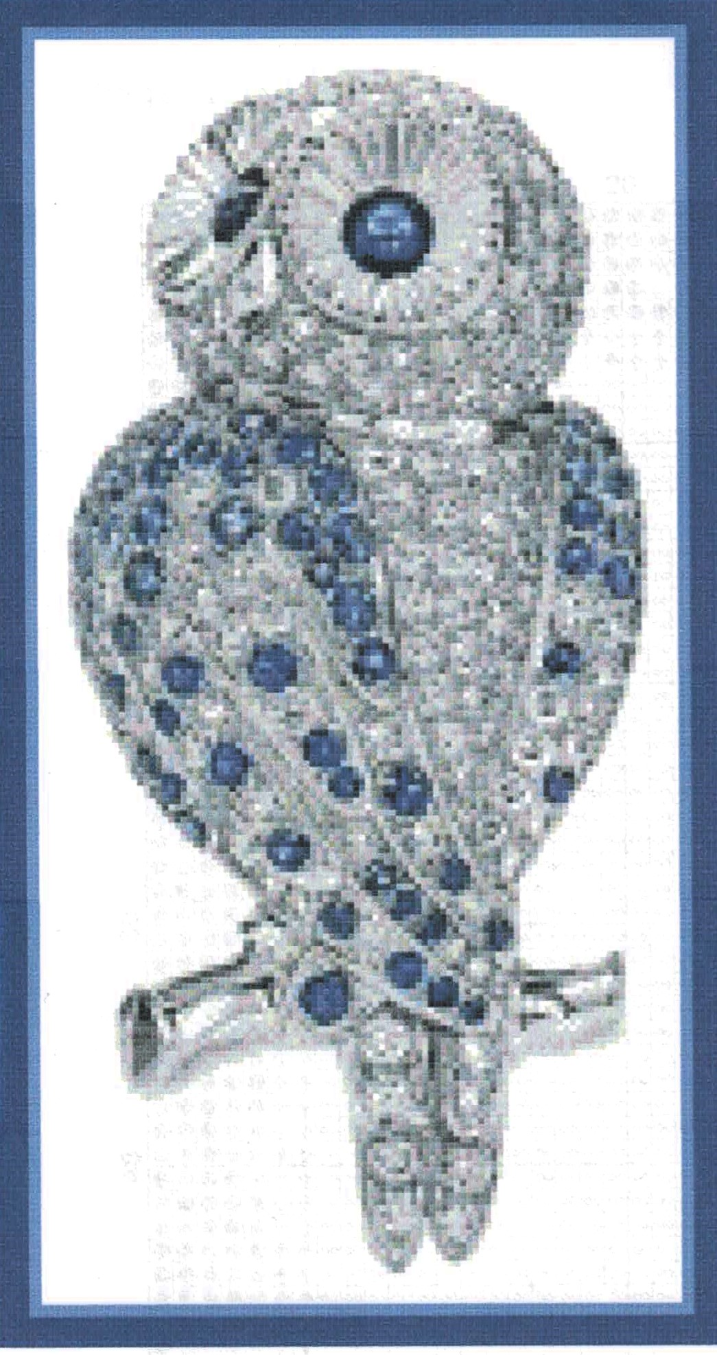 This stunning cross stitch pattern features a majestic owl rendered in gorgeous shades of blue and white, creating an almost crystalline or jewel-like effect. The intricate spotted plumage and piercing blue eye make this a captivating piece that will challenge and delight experienced stitchers.