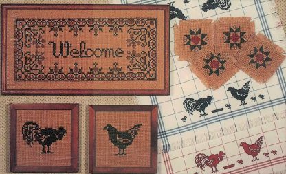 This collection of designs, a Welcome piece, a rooster, a chicken, and geometric Amish pattern, can be stitched at a small count on placemats or a large count to hang on the wall.