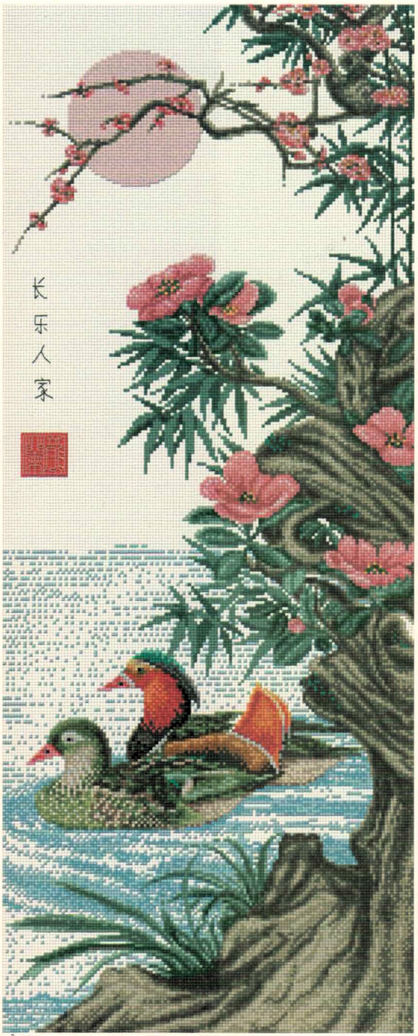 This exquisite design captures the serene beauty of mandarin ducks in their natural habitat, with intricate details in the birds’ plumage and the delicate flowering branches above. The composition follows traditional Asian artistic principles with its vertical format and harmonious balance of water, flora, and fauna, making it a sophisticated piece perfect for experienced stitchers who appreciate cultural artistry.