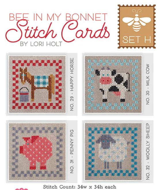 The Bee in My Bonnet Stitch Cards come with full-color instructions, diagrams and supply list, including suggested DMC colors. Each set includes four stitch cards printed on durable cardstock and comes in a plastic bag.