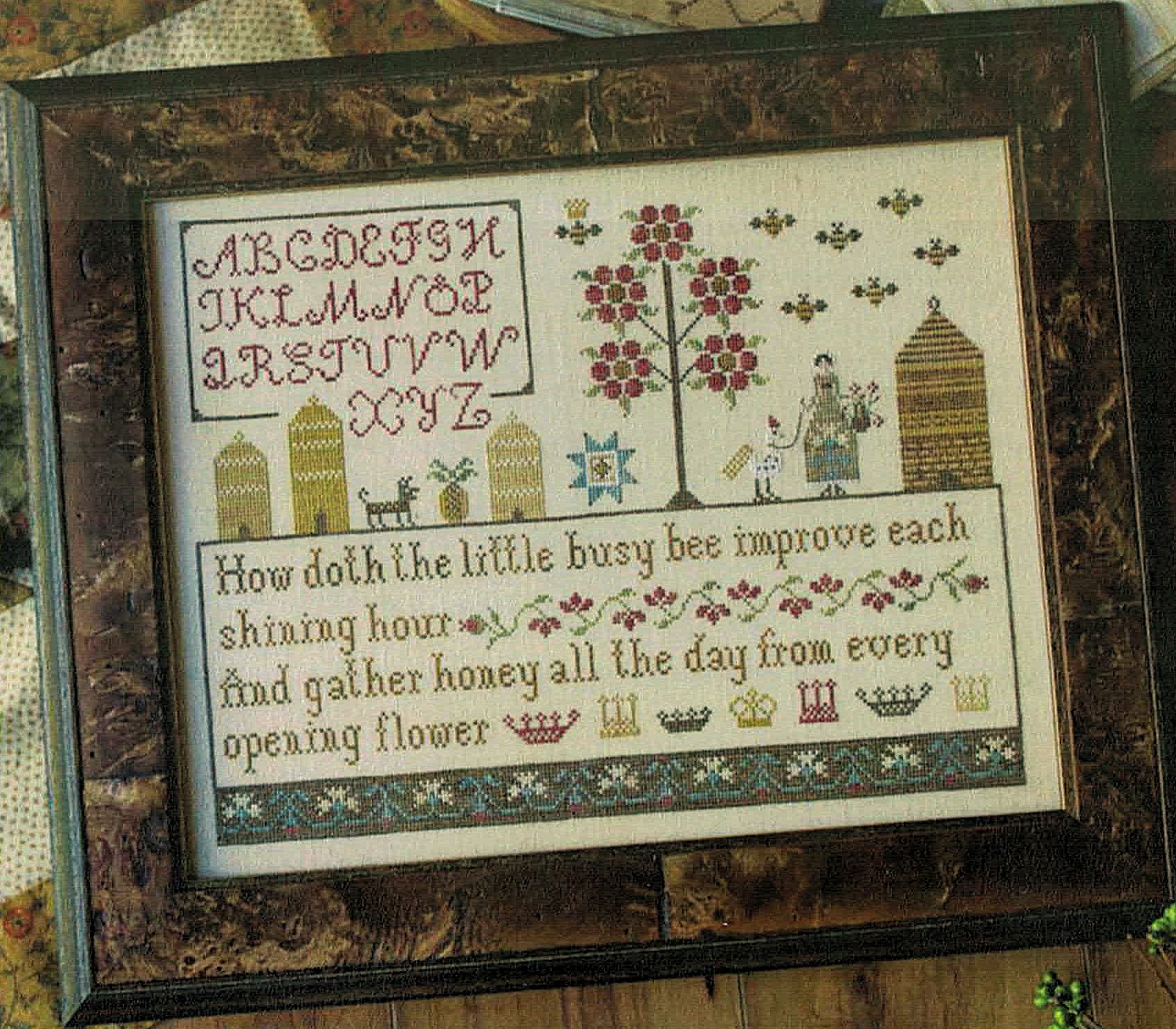 This charming sampler features a traditional alphabet, quaint village scene with beehives, and the sweet verse ‘How doth the little busy bee improve each shining hour.’ Perfect for stitchers who love classic samplers with meaningful messages about nature’s industrious workers.