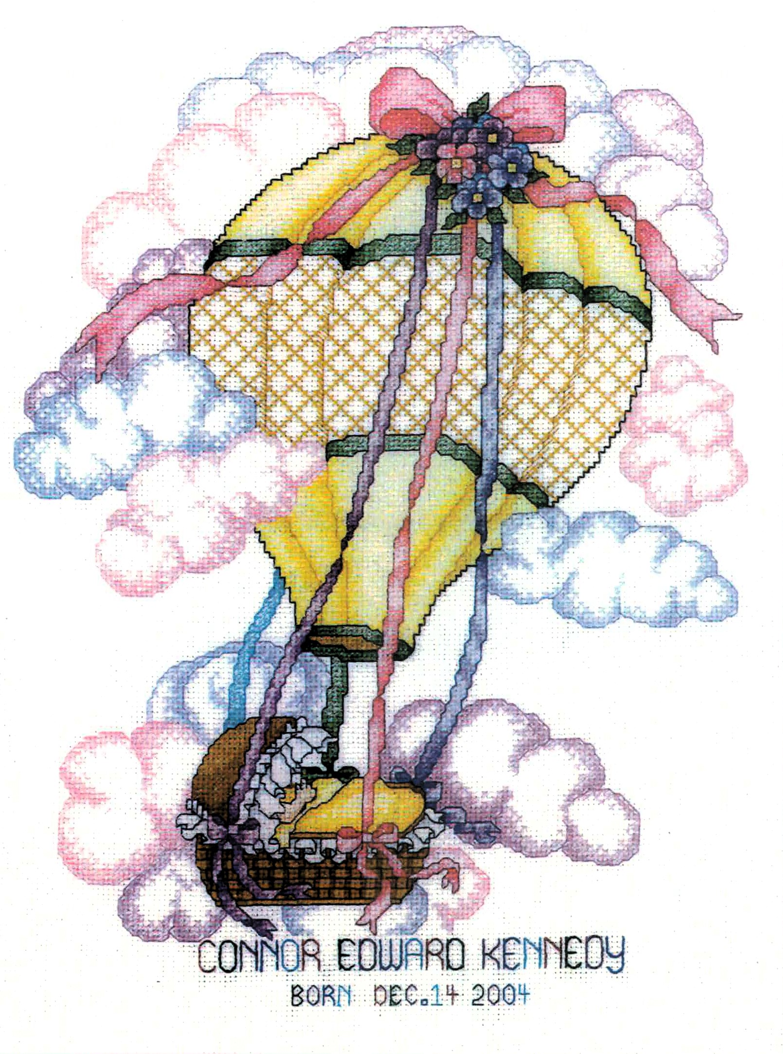 A sweet new baby, floating through a calm sky of fluffy clouds, is on its way to a special home near you! Stitch this adorable baby sampler for a much-loved child in your life.
