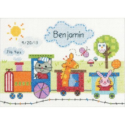 Choo-choo! These bright-eyed creatures are pulling in to the station to announce baby’s arrival! The Train Birth Record features a colorful array of threads.