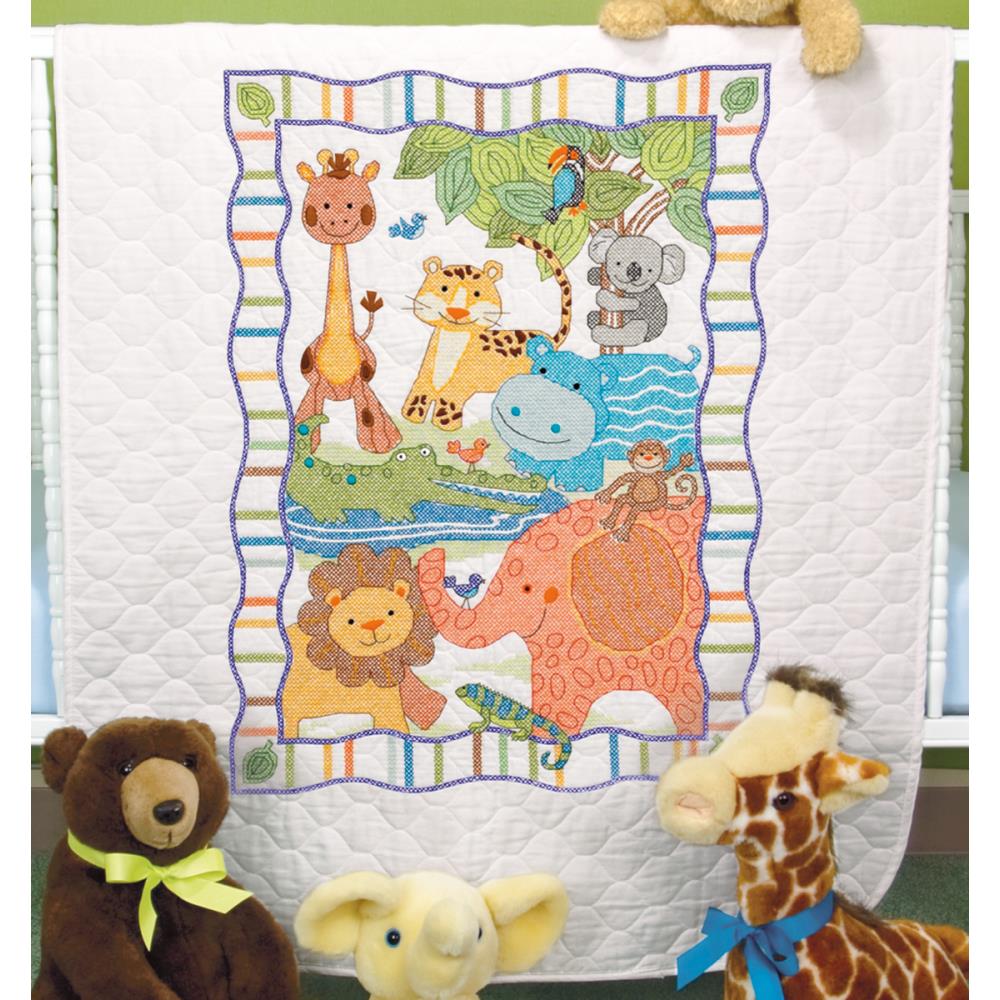 Stamped Cross Stitch Kit from Dimensions contains: presorted cotton threads, prefinished poly/muslin quilt printed in wash-away ink, needle, and easy instructions. Designed by Wendy Bentley.
