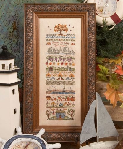 East Coast Sampler from the American Journey Series. The New England state of Connecticut comes to life in this vibrant sampler. Come Beside the Long Tidal River and enjoy the abundance of the gardens, and the romance of the ships that sail to and fro on the lapping waves of the Atlantic.
