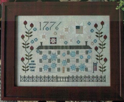The design showcases a grand three-story colonial inn as the centerpiece, complete with multiple windows and classic proportions that evoke the revolutionary era. Delicate flowering vines frame the building while traditional sampler motifs and the date 1776 celebrate America’s founding spirit, making this perfect for patriotic displays or historical home decor.