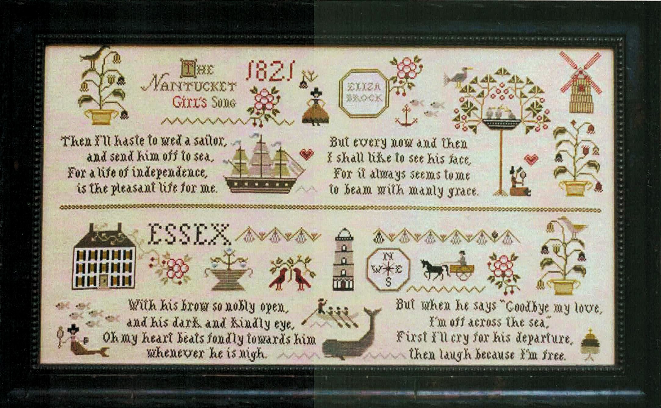 This charming original sampler tells the whimsical story of a Nantucket girl’s song about sailors and the sea, featuring delightful maritime motifs and traditional sampler elements. This nostalgic piece combines romantic verse with beautiful decorative borders and nautical imagery including ships, windmills, and coastal scenes.