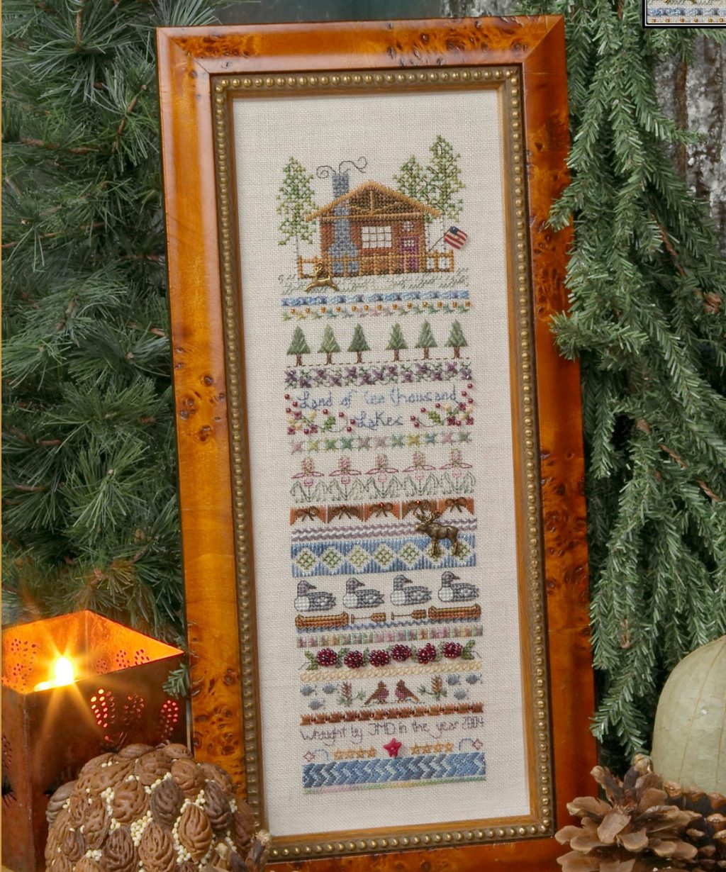 Northwoods Sampler from the American Journey Series. This lovely celebration of the American Midwest includes several variations for different states (Michigan, Great Water, with orchard motifs, or Wisconsin, Grassy Plains, with farm, cheese wheel, and violets). The Minnesota variation is shown (loons, ladyslippers, Land of Ten Thousand Lakes). This sampler has a special place in my heart, being from Wisconsin and living in Minnesota. It was the first design of Jeannette’s I ever stitched – I did it in a week at a cabin in the Boundary Waters. Delightful!