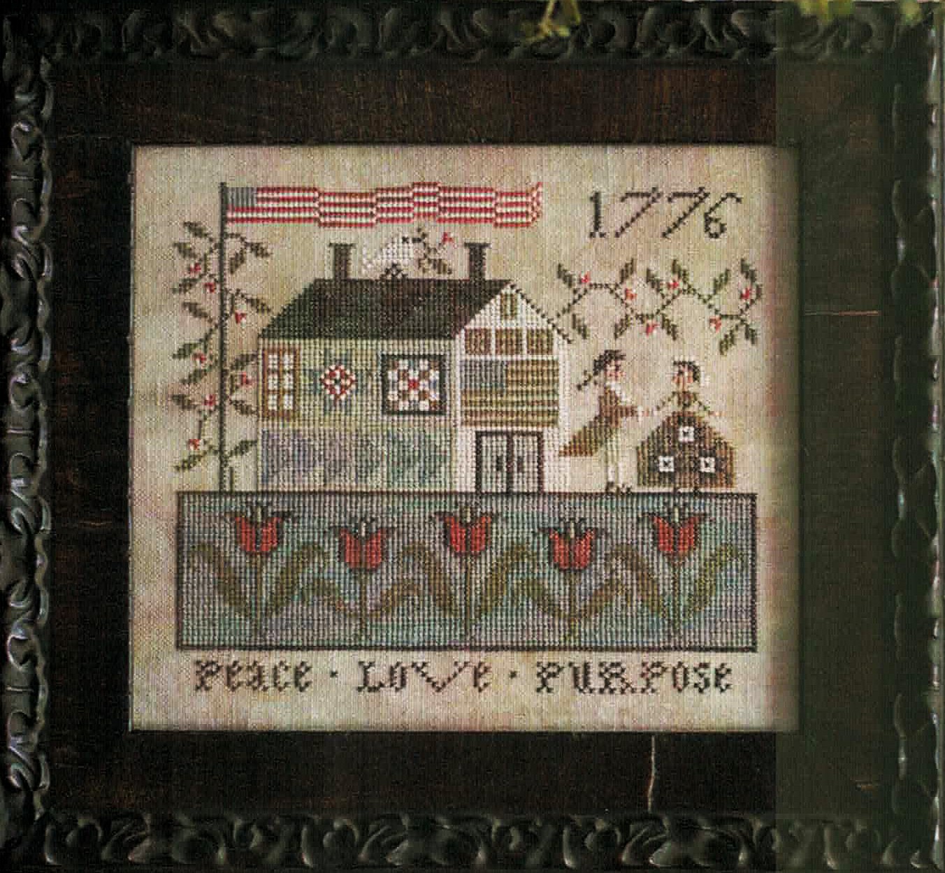 The design showcases a detailed colonial-style house with geometric quilt patterns in the windows, set against a backdrop of trailing floral vines and tulips along the garden border. The earthy color palette of muted greens, browns, and brick tones creates an authentic vintage americana feel that captures the spirit of our founding era.