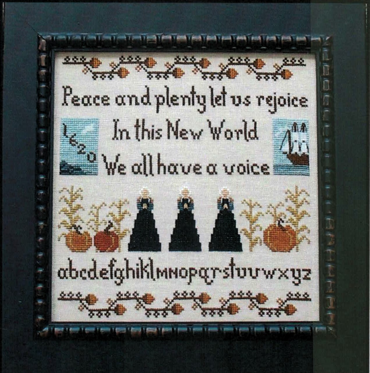This historically-inspired sampler commemorates the first Thanksgiving with the message “Peace and plenty let us rejoice In this New World We all have a voice.” Features three Pilgrim figures, decorative ships, pumpkins, and ornate borders with a complete alphabet, perfect for celebrating America’s founding traditions.