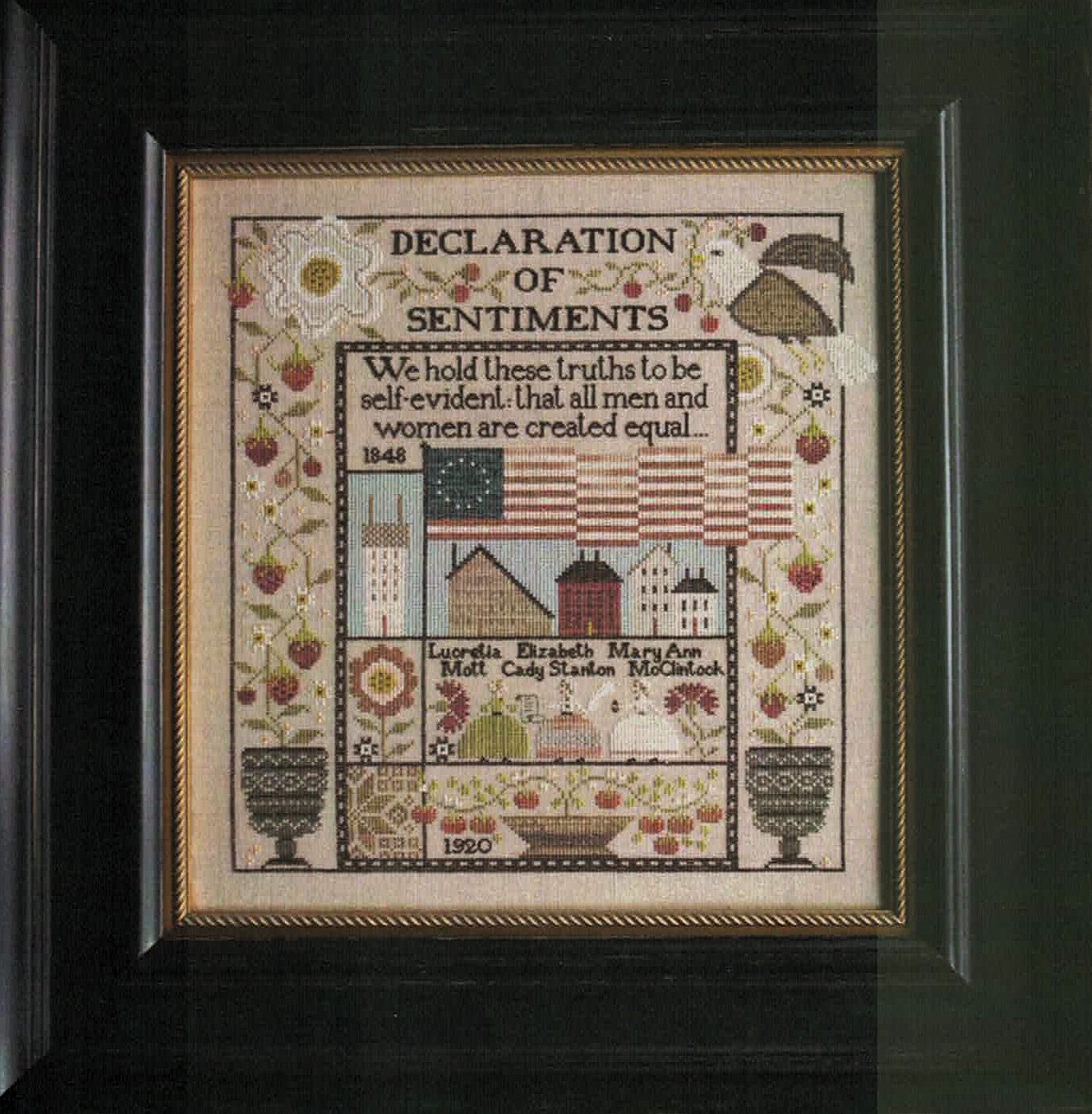 This sophisticated sampler features the powerful Declaration of Independence quote ‘We hold these truths to be self-evident: that all men and women are created equal’ alongside a beautifully detailed early American flag and charming village buildings. The design incorporates traditional sampler motifs including floral borders, decorative urns, and period typography, creating a meaningful tribute to the suffrage movement and American equality ideals.