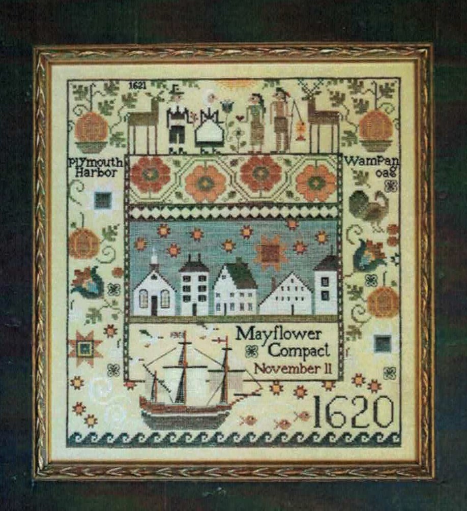 This stunning historical sampler captures the essence of America’s founding story with intricate details of the Mayflower ship, Plymouth Harbor village, and traditional colonial decorative elements. The rich color palette of muted blues, warm browns, and autumn tones perfectly evokes the atmosphere of early New England, while the traditional sampler format pays homage to the needlework heritage brought to the New World.
