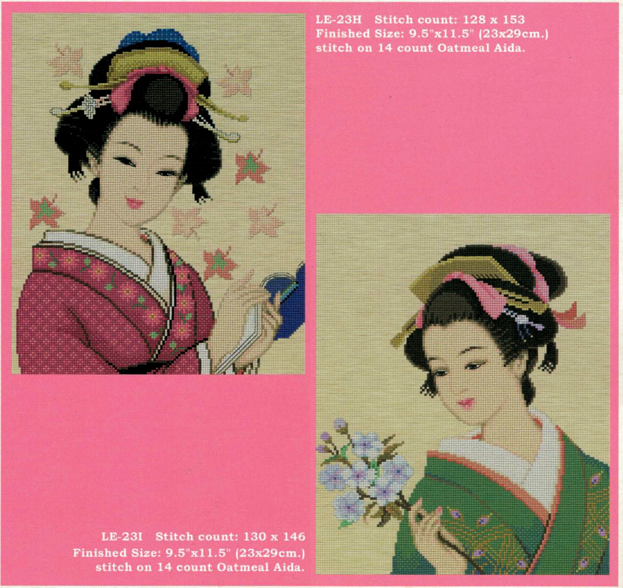 This exquisite Japanese Beauty cross stitch pattern features two elegant geishas in traditional kimono, showcasing the grace and artistry of Japanese culture. Each design captures intricate details from ornate hair ornaments to delicate floral motifs, making this an ideal project for stitchers who appreciate cultural art.