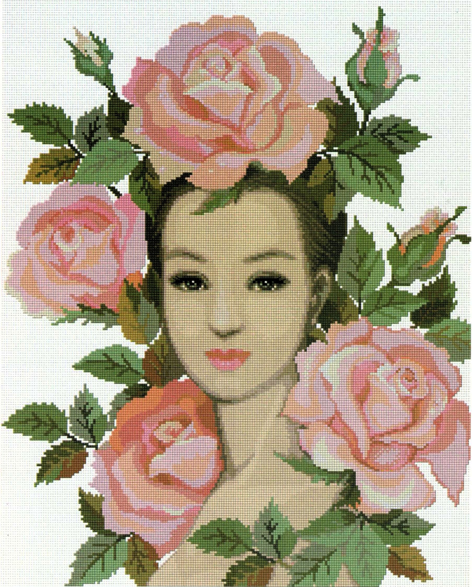 The pattern showcases a sweet baby’s face nestled among blooming pink roses with rich green foliage, creating a dreamy garden portrait reminiscent of Victorian-era baby photography. The artistic composition blends realistic portraiture with decorative floral elements, offering stitchers the opportunity to create a treasured keepsake that celebrates the innocence and beauty of infancy surrounded by nature’s splendor.