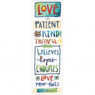 The well-known and well-loved verse from 1 Corinthians 13 is featured in a colorful, contemporary way on Love Is. This counted cross stitch design makes a meaningful gift for a family member or friend.