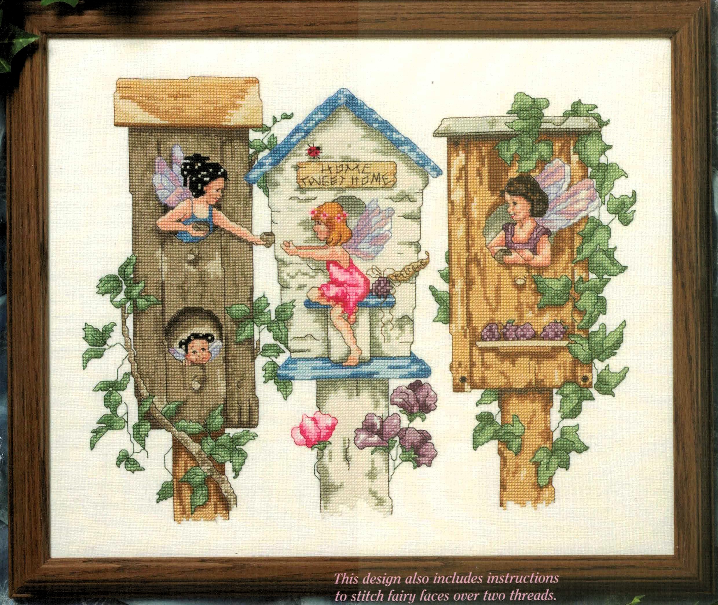 A community of dainty little fairies has blessed this adorable lineup of birdhouses with extra charm.