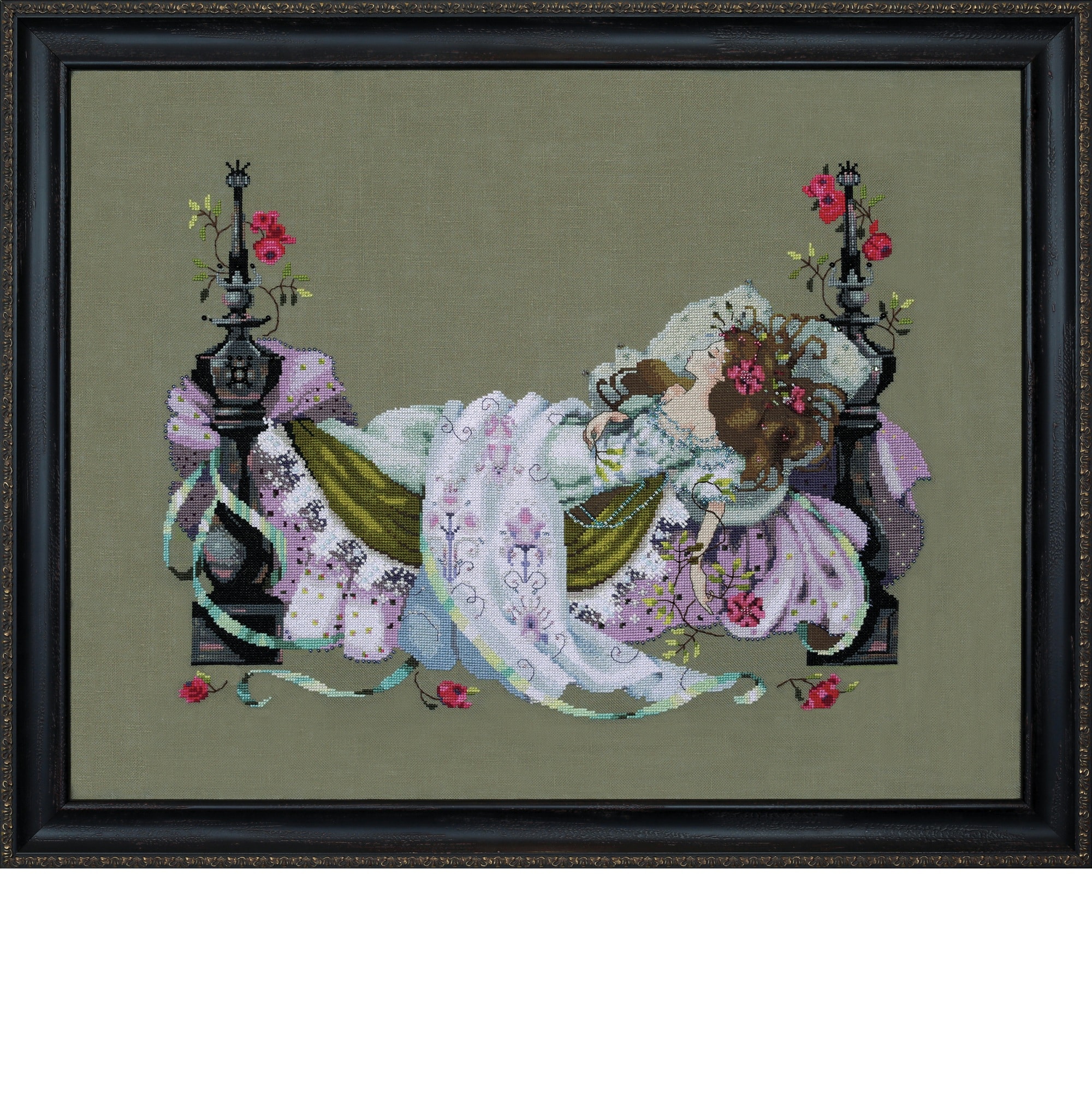 There are many versions of her story. Here she is draped in delicate violet and lavender quilts. She is wrapped in ribbons. Crystals accentuate her linens. She dreams of roses cascading castle steps. The myth of the sleeping princess will forever enchant us.