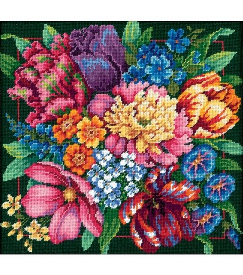 Lose yourself in the brilliance of this stunning Needlepoint bouquet. Poppies, Peonies, and Tulips in all shades burst with color against a black background. Finish as a throw pillow, as shown, or an equally beautiful wall-hanging. A gold frame will make this floral splendor really pop.