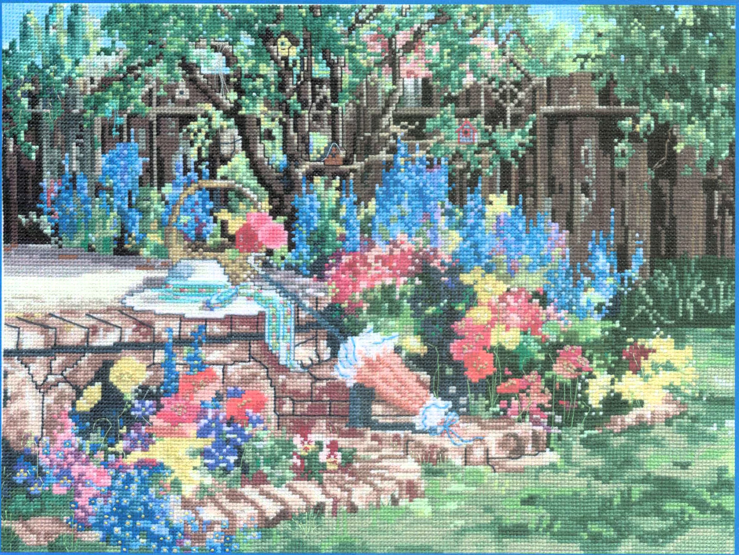 Transform your home into a blooming paradise with this stunning garden scene full-coverage cross stitch pattern. Features a charming rustic stone pathway winding through vibrant flower beds bursting with colorful blooms in shades of blue, pink, coral, and yellow, all framed by lush greenery and mature trees.
