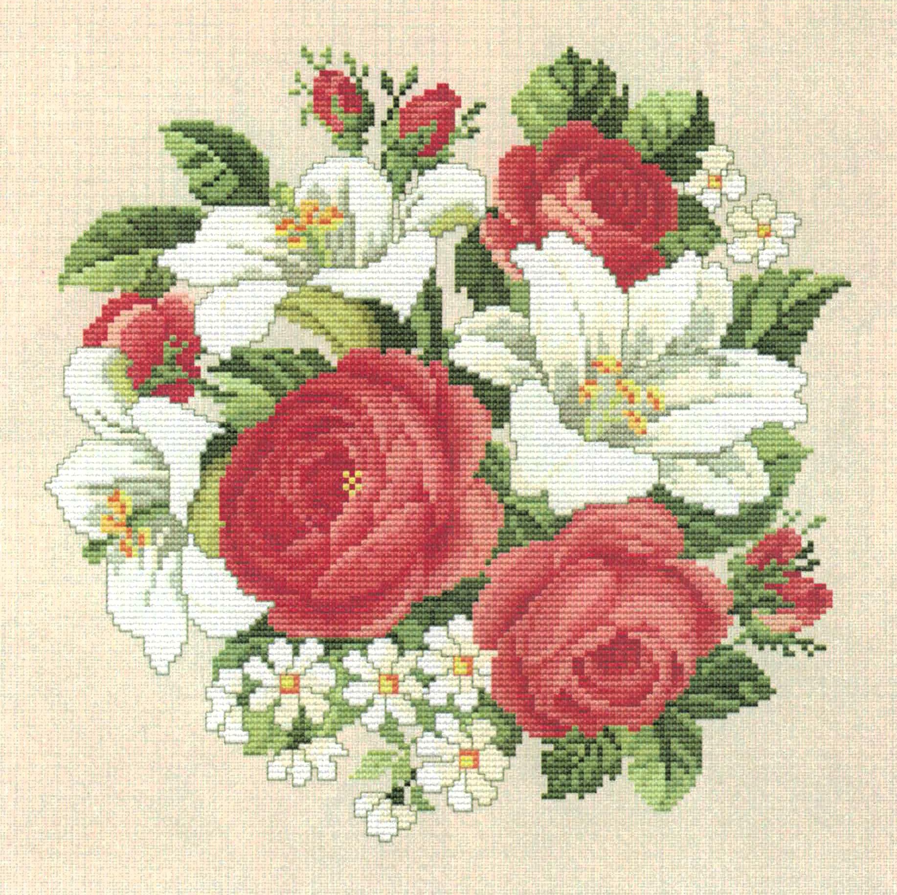 This wonderful bouquet of creamy lilies and red roses is the perfect accent for any sort of linens, or as a stand-alone design.