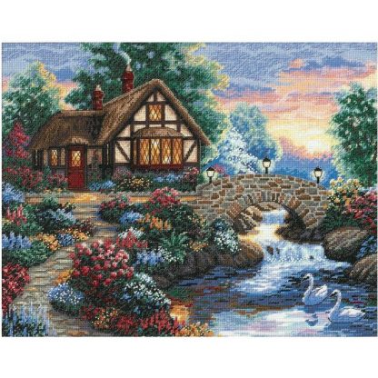 The Twilight Bridge features a cobbled path that runs along the stream where two elegant swans wait to greet any passersby. This warm and inviting scene uses half cross stitch to create shading and wonderful evening shadows. From the Dimensions Gold Collection.