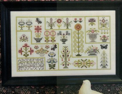 This sampler was inspired by a piece of antique lace that had a stair step look. I added sampler flowers to the pathway.