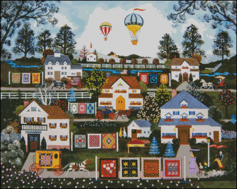 All of the colorful quilts are on display on this fine day at Cape Cod. The sun is out and the villagers can peruse all the fine handiwork of the quilters.