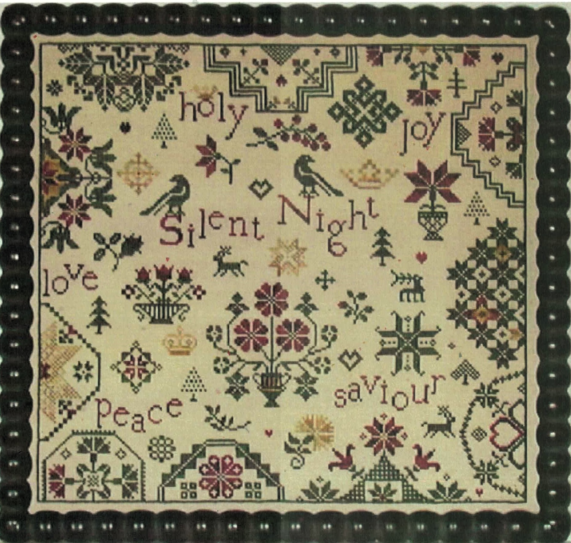 The sampler showcases a harmonious blend of Christmas imagery with words of faith including “holy,” “joy,” “love,” “peace,” and “saviour” scattered throughout the design. Traditional sampler elements like decorative borders, geometric motifs, and stylized birds create an heirloom-quality piece that celebrates both the religious and festive aspects of Christmas.