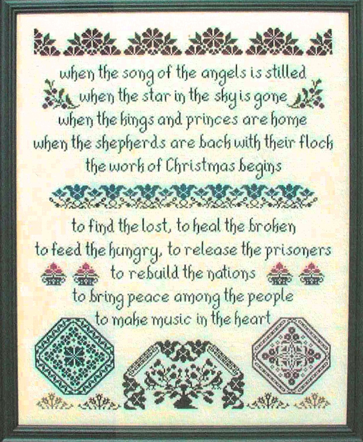 This thoughtful sampler features a touching poem about the ongoing work of Christmas throughout the year – finding the lost, healing the broken, and bringing peace. The design showcases beautiful hand-lettered text complemented by delicate floral sprigs, decorative borders, and three ornate geometric medallions at the bottom, all worked in a harmonious palette of muted greens and warm earth tones.