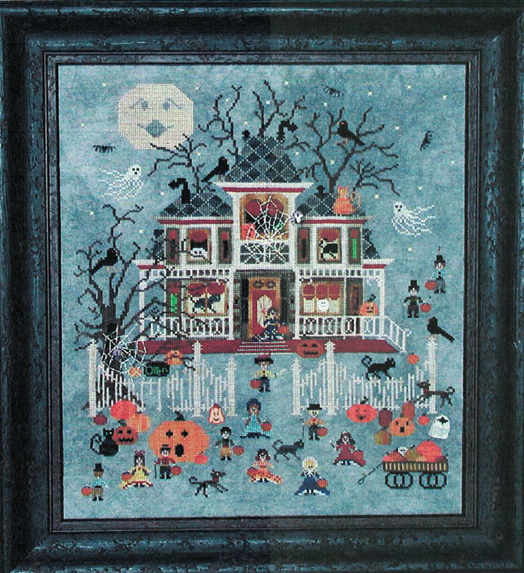 A spooktacular Halloween cross stitch pattern featuring a haunted Victorian mansion surrounded by trick-or-treaters, ghosts, and jack-o’-lanterns under a full moon. This advanced design captures the whimsical spirit of Halloween with its detailed architectural elements and charming collection of costumed characters scattered throughout the moonlit scene.