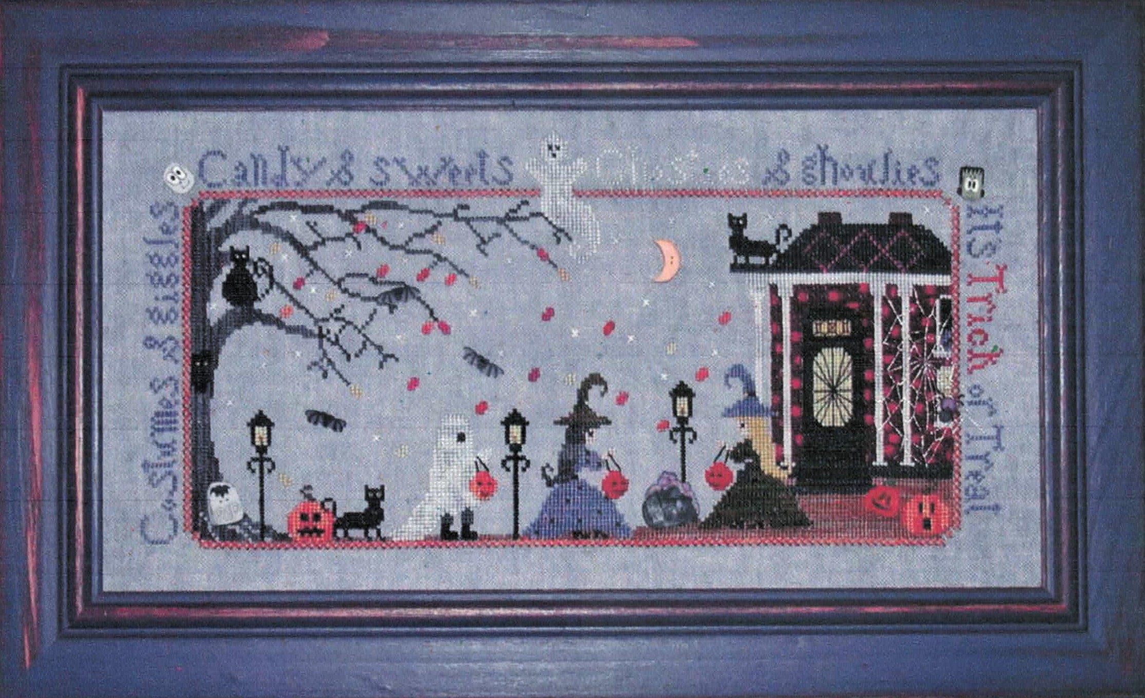 This delightful Halloween sampler showcases a perfectly spooky neighborhood scene with silhouetted figures, atmospheric lighting, and classic Halloween imagery arranged in a traditional sampler format. The design features beautiful contrast between dark silhouettes and the soft blue-gray background fabric, creating a moonlit Halloween evening that’s both festive and elegant.