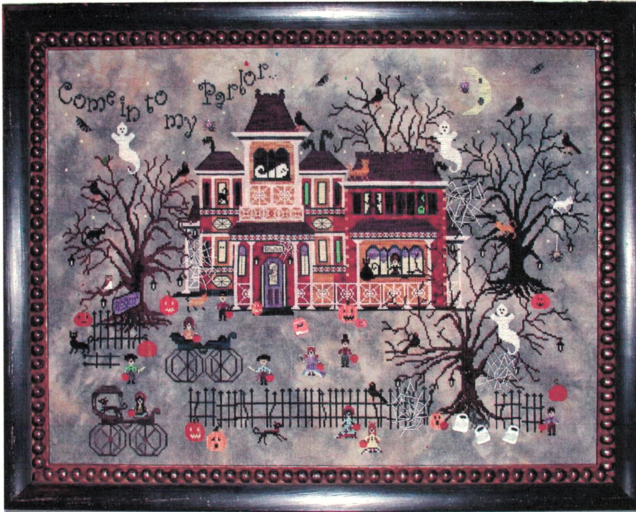 This enchanting Halloween sampler showcases a grand Victorian bed and breakfast complete with ornate gingerbread trim, multiple stories, and charming architectural features. The design is filled with delightful spooky details including floating ghosts, bare twisted trees, jack-o’-lanterns, costumed children, and the welcoming text ‘Come in to my Parlor’ across the top, all set against a mysterious twilight sky.