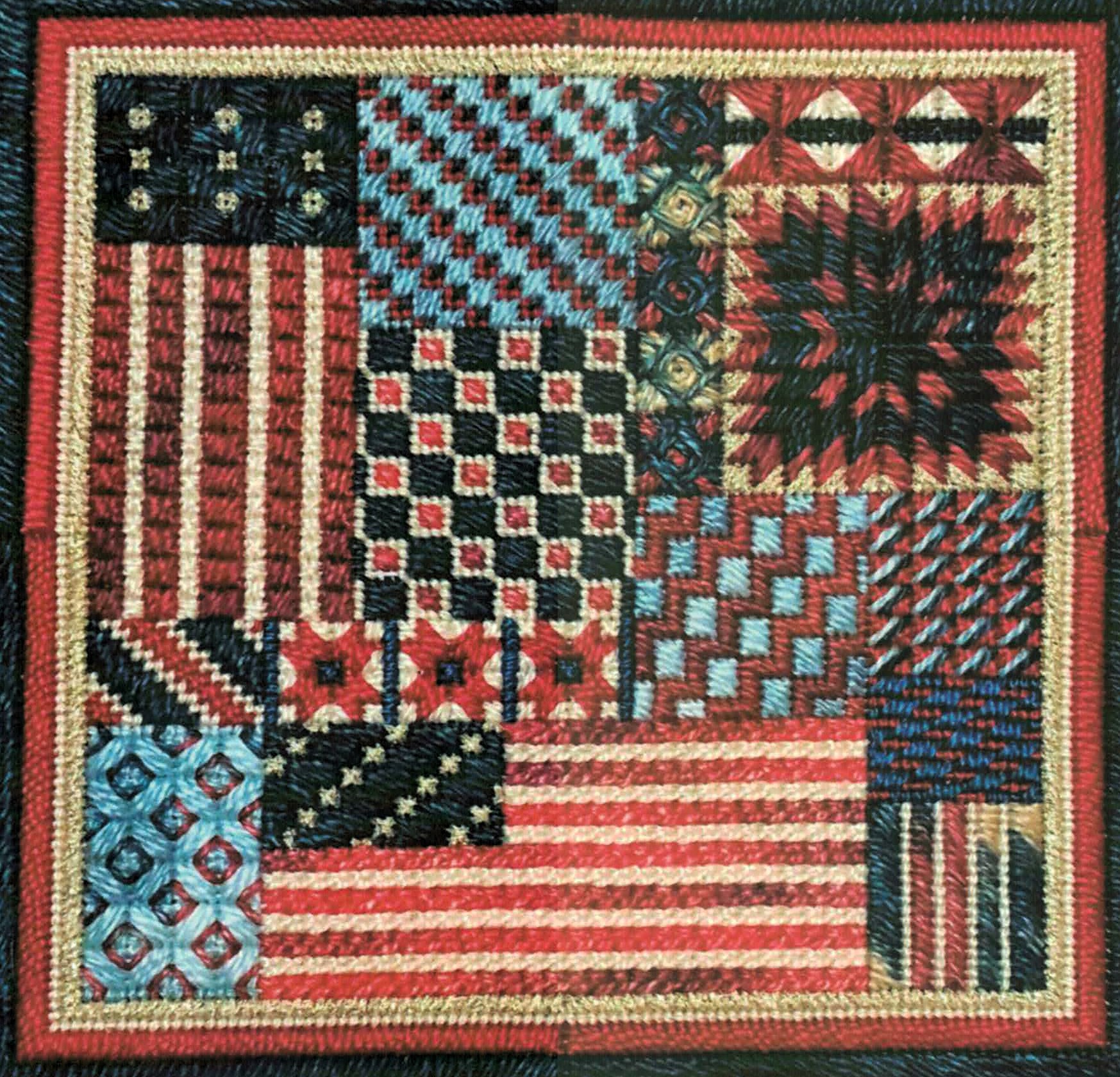 This sophisticated sampler combines the artistry of traditional American quilting with needlepoint craftsmanship, featuring nine distinct patchwork blocks that frame a central stars and stripes motif. The design showcases classic quilt patterns including checkerboard, diamond lattice, and geometric florals, all rendered in a harmonious palette of deep navy, crimson red, and antique gold that captures the timeless spirit of American heritage.