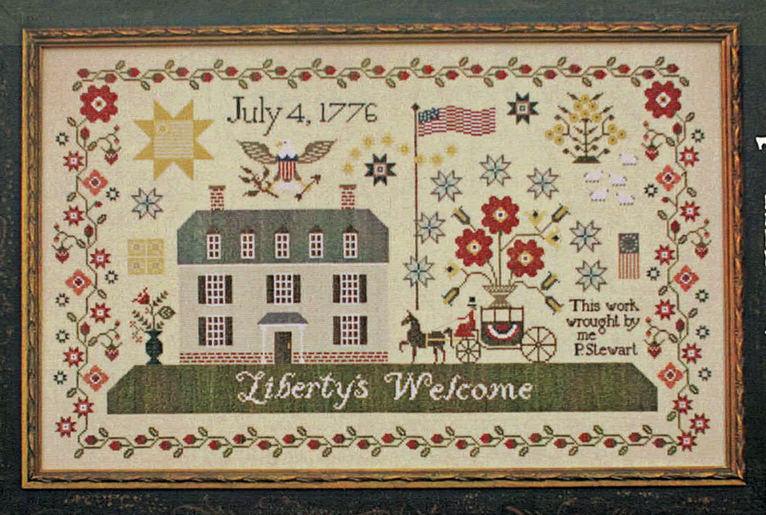 This sophisticated sampler captures the spirit of American independence with its rich historical imagery and traditional color palette. The design features intricate decorative elements including geometric stars, floral motifs, and a charming colonial scene that will become a treasured heirloom piece perfect for displaying year-round or during patriotic celebrations.