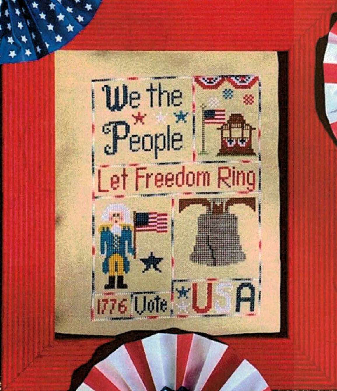 This charming patriotic sampler combines traditional American symbols with inspiring text in a vintage-style layout that evokes the spirit of our nation’s founding. The design features classic motifs including Uncle Sam in colonial attire, the Liberty Bell, and patriotic stars arranged around the central message, all stitched in traditional red, white, and blue colors with earthy accents.