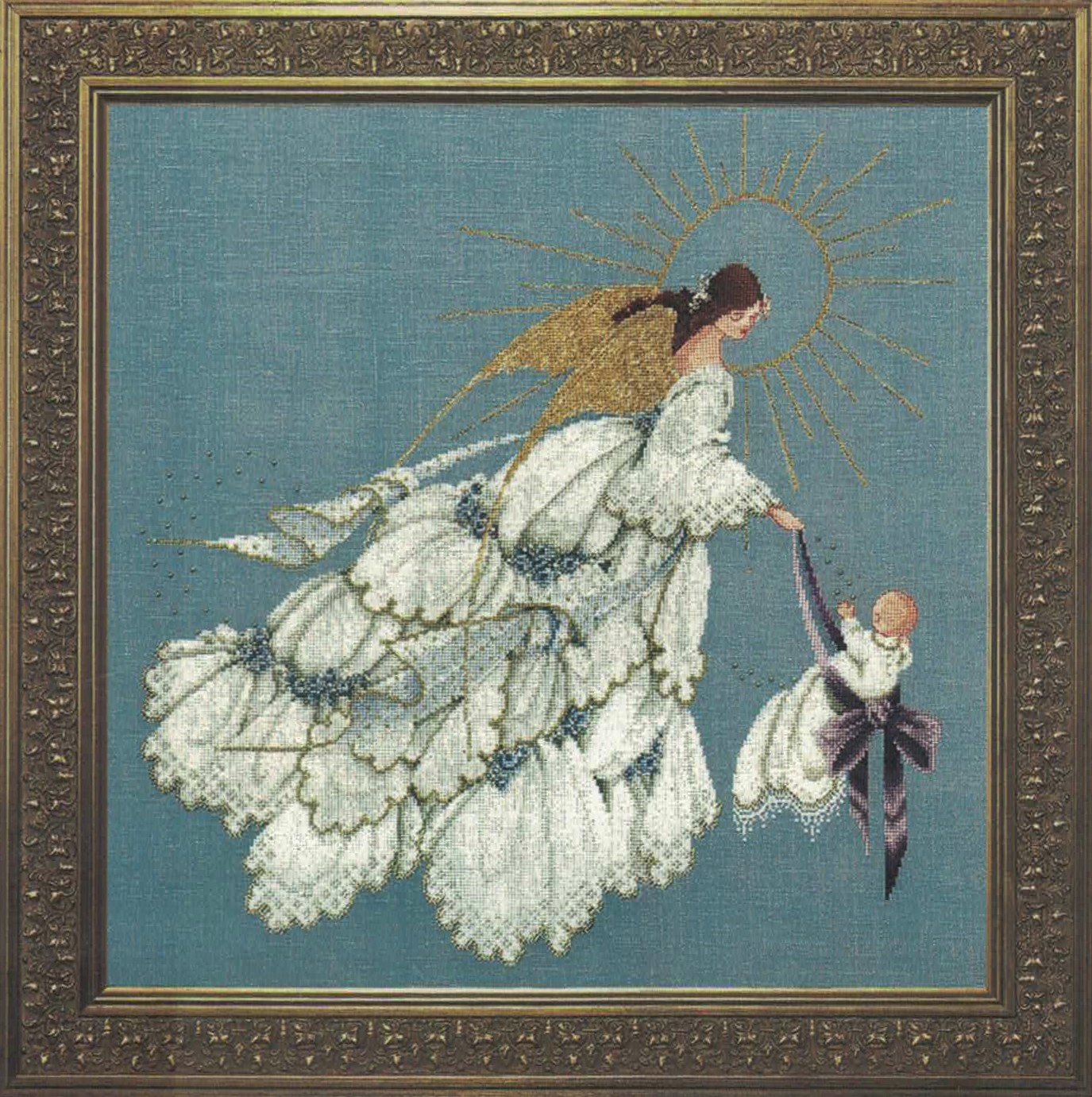 By combining the designs shown in “Angel of Mercy” and “Angel of Mercy II,” you can create two designs with the angels facing each other, and personalize the children shown in the pictures. The color of the baby’s ribbon can be changed as desired, and the colors in the little boy’s sweater can be changed to school colors or any other colors desired. The angel can also be stitched alone.