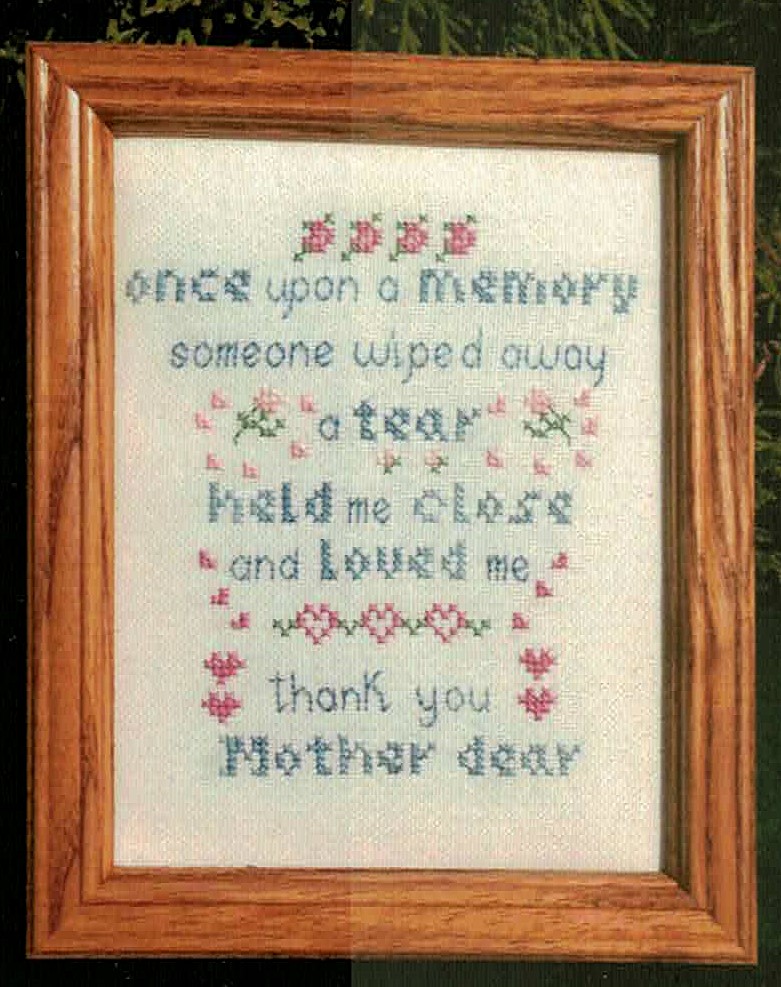 This touching sampler celebrates the unconditional love of mothers with its poignant verse surrounded by charming pink roses and delicate floral borders. The soft color palette of peachy pinks and deep blues creates a timeless, nostalgic feel that makes this piece perfect for gifting or displaying as a treasured family heirloom.