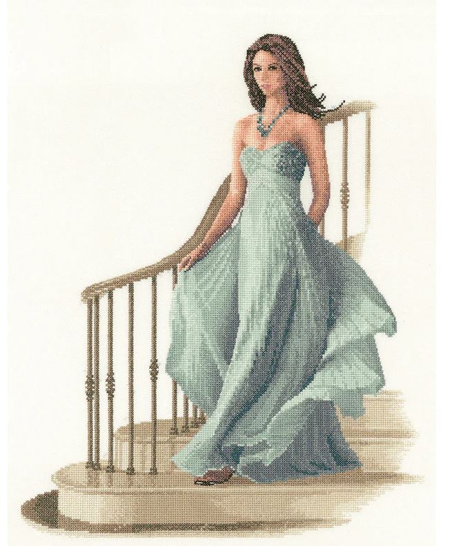 Lousia sweeps down the stairs, with sultry eyes and a flowing blue dress.