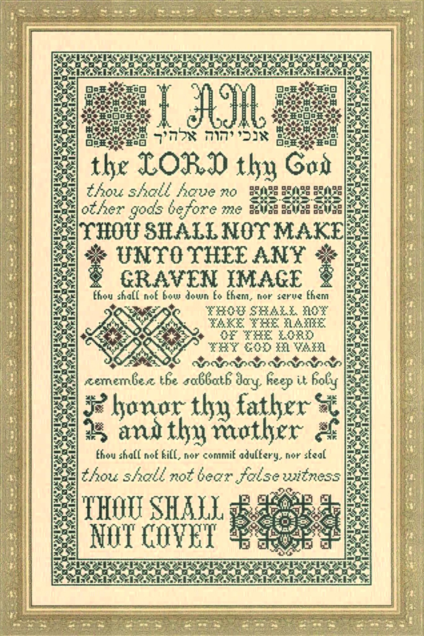 This stunning sampler presents the Ten Commandments in their traditional King James Version text, enhanced with Hebrew script and surrounded by elaborate geometric borders reminiscent of classic 19th-century needlework. The design features beautiful decorative motifs including stylized flowers and traditional sampler elements that frame the sacred text with reverence and artistry.