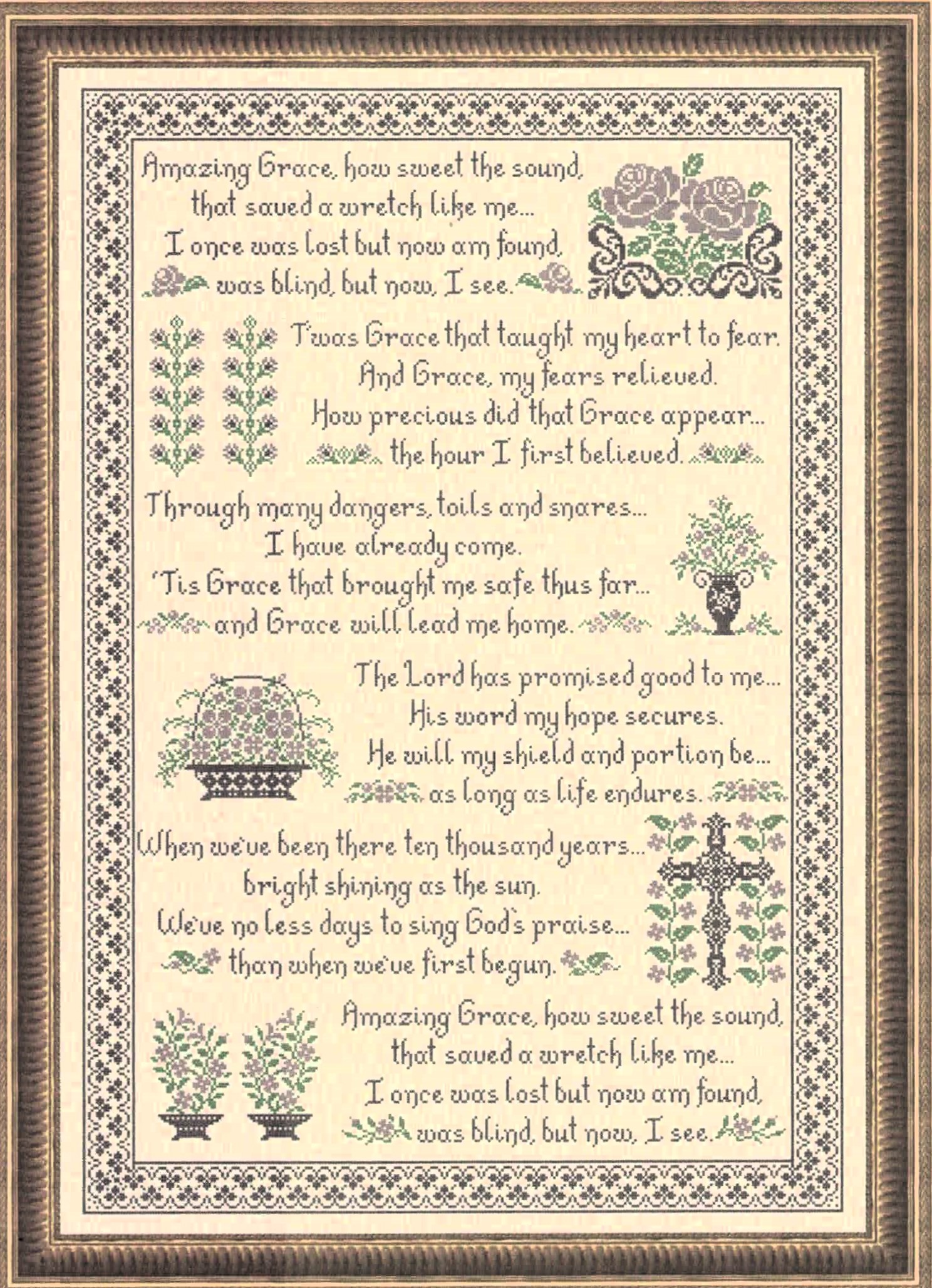 This stunning religious sampler features the complete lyrics to the cherished hymn “Amazing Grace” elegantly arranged with beautiful floral elements including roses, decorative urns with flowing botanicals, and an ornate cross. The traditional sampler design is enhanced by a sophisticated geometric border and subtle color palette that creates a timeless piece perfect for display in any home.