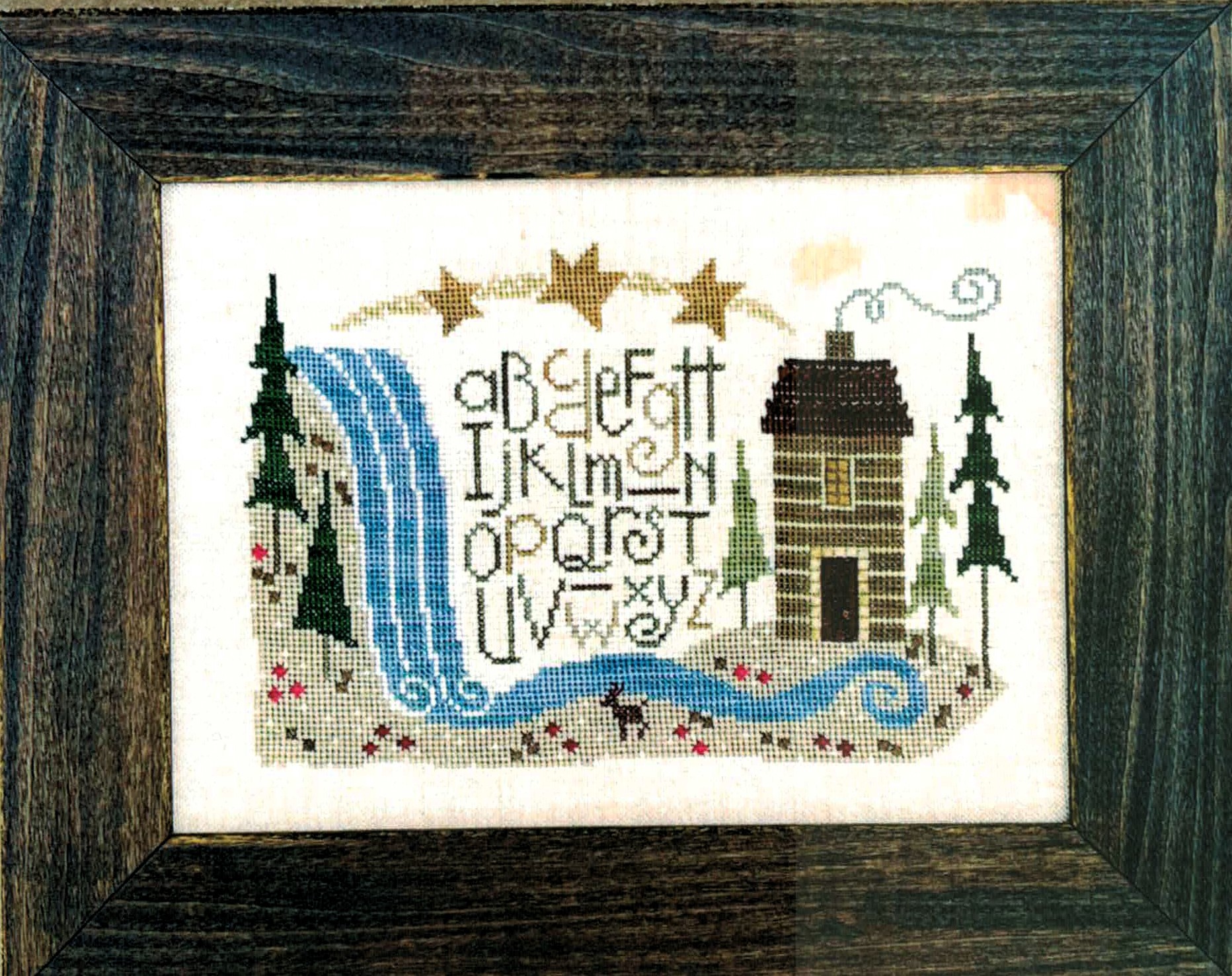A whimsical alphabet is set in a Northwoods scene, with waterfalls and bright stars overhead the snug little cabin.