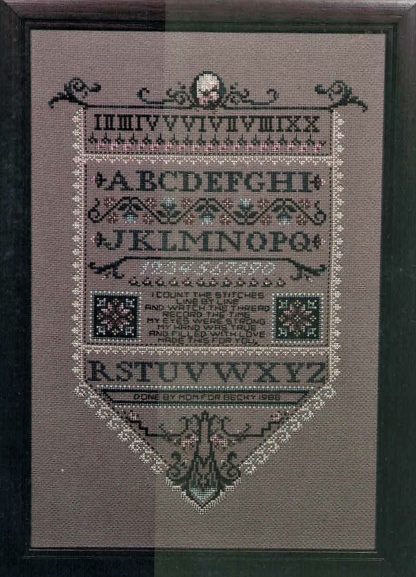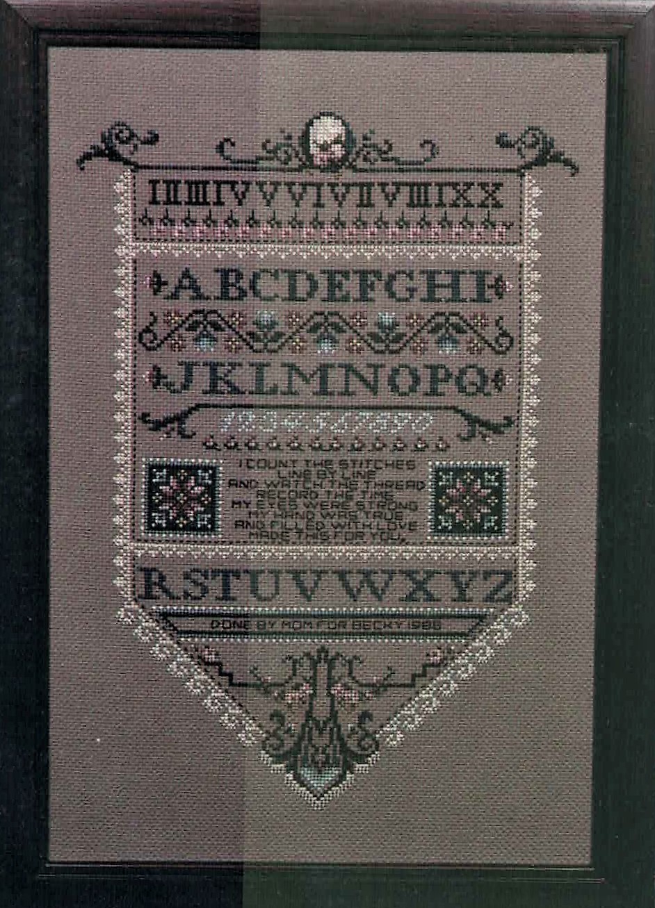 The model is stitched on 14ct Taupestone Aida, which is discontinued. We recommend Pewter.