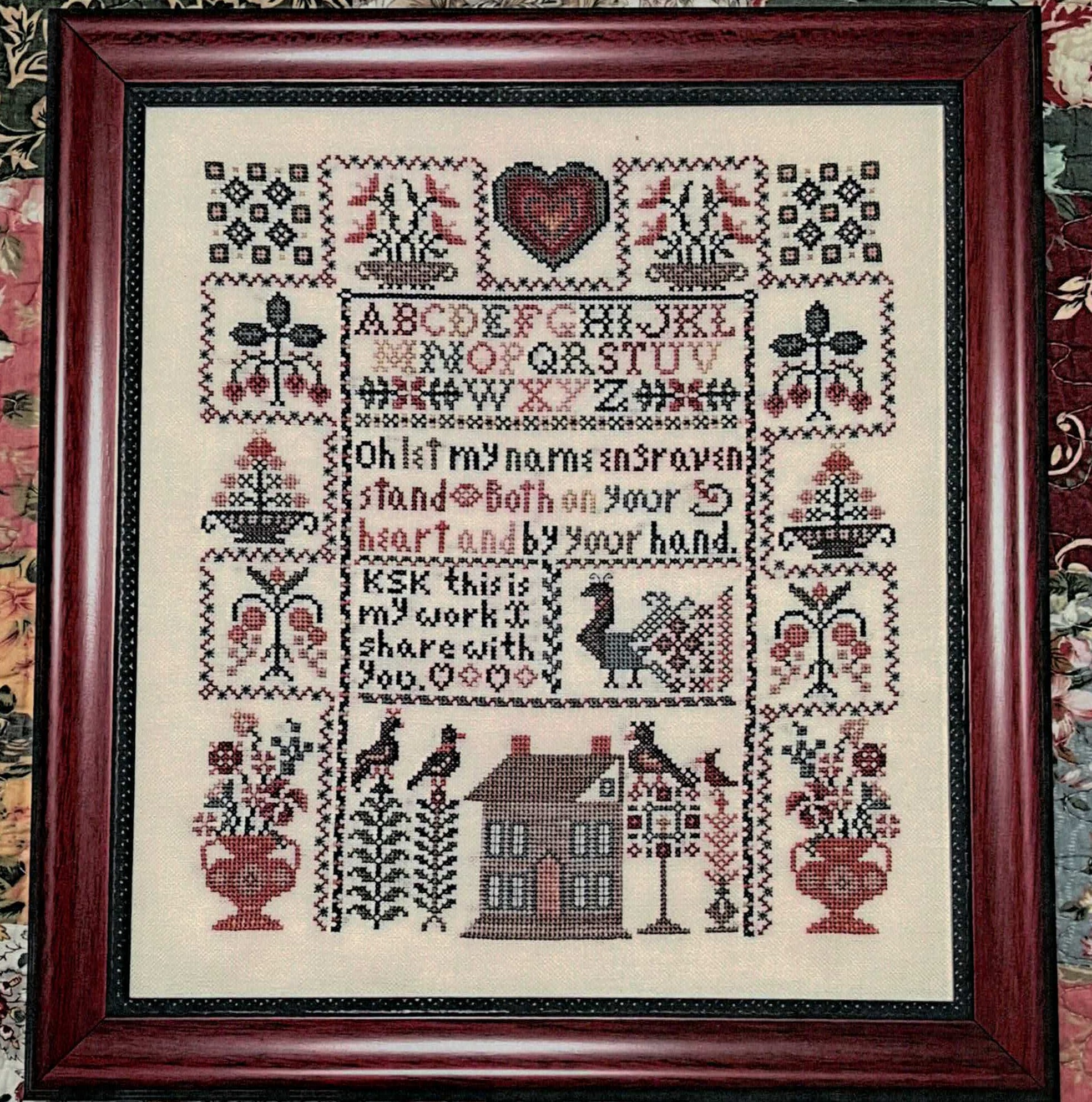 “Oh let my name engraven stand both on your heart and by your hand.” This sampler is stitched in beautiful overdyed threads, with meaningful motifs celebrating domestic comforts and the joy of simple things.