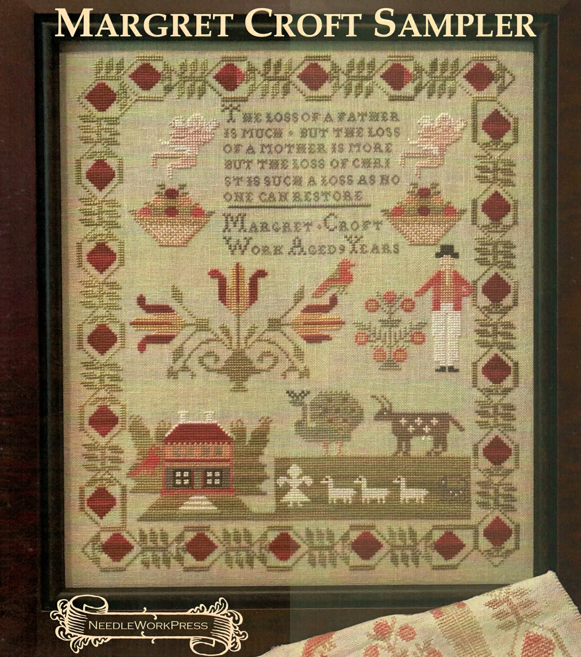 This beautiful sampler reproduction features Margaret Croft’s touching verse about maternal loss surrounded by traditional motifs including flowers, birds, trees, houses, and farm animals. The design showcases classic sampler elements with a distinctive border of diamond and vine patterns, all rendered in warm, muted tones that evoke the charm of 18th and 19th century needlework.
