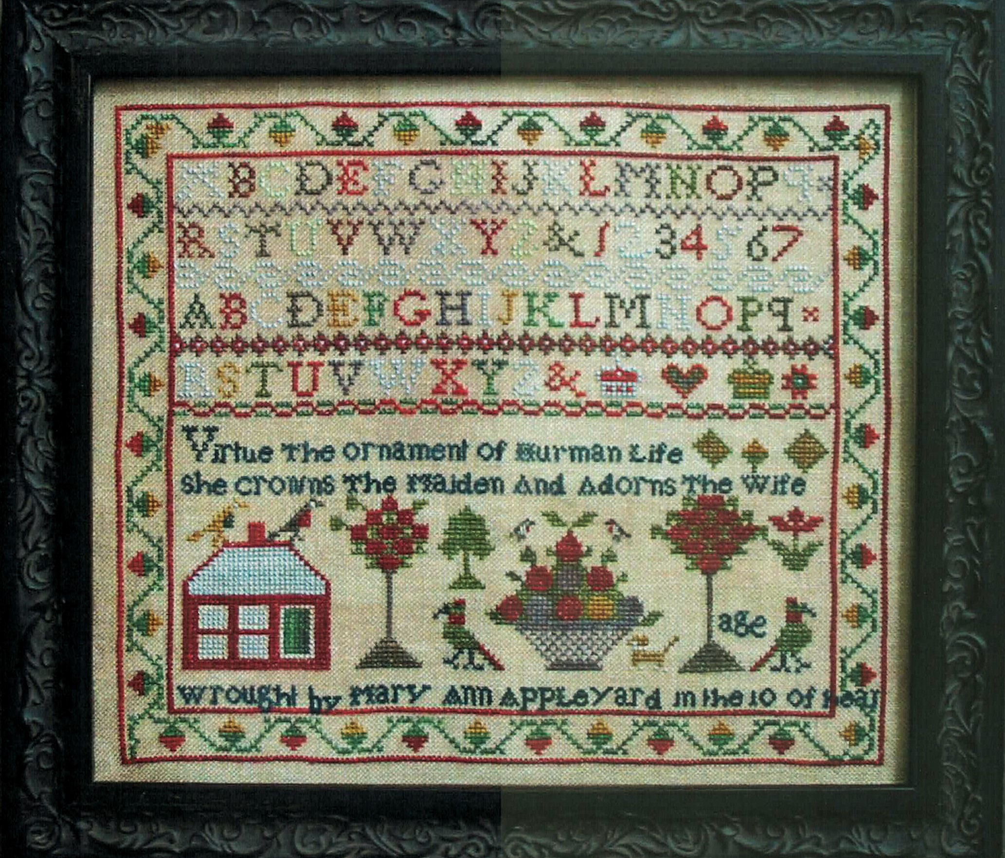 Mary Ann Appleyard captures the essence of historic American samplers with its thoughtful composition featuring rows of alphabets, numbers, and the inspiring verse ‘Virtue The Ornament Of Human Life She Crowns The Maiden And Adorns The Wife.’ The lower portion displays charming motifs including a red-roofed house, stylized trees, and an overflowing fruit basket, creating a harmonious blend of educational and decorative elements typical of 19th-century needlework.